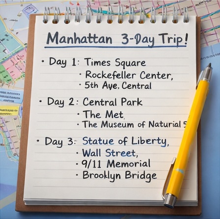 1일차는 미드타운, 2일차는 센트럴파크와 박물관, 3일차는 로어 맨해튼과 브루클린 브리지로 나누면 뉴욕의 대표적인 얼굴을 균형 있게 볼 수 있습니다.