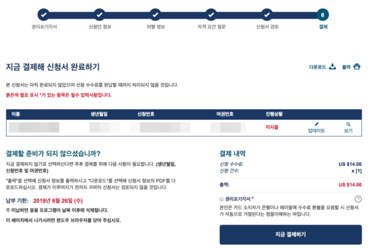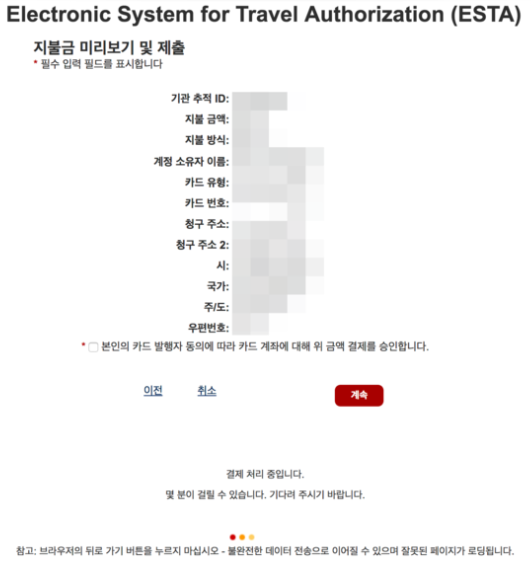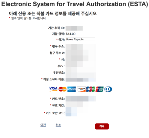 - 신청비: ESTA 신청에는 신용카드 또는 직불카드를 사용하여 지불해야 하는 수수료가 있습니다. 신청이 거부되더라도 수수료는 환불되지 않습니다.