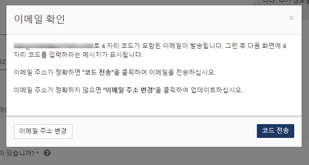 이메일주소 입력 후 다음 누르면 새창이 뜨구요. 코드 전송을 누르면 다른 창이 뜨면서 코드 입력하라고 나옵니다.